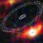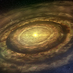 Artist impression of the debris disc and planets around the star known as Gliese 581, superimposed on Herschel PACS images at 70, 100 and 160 micrometre …